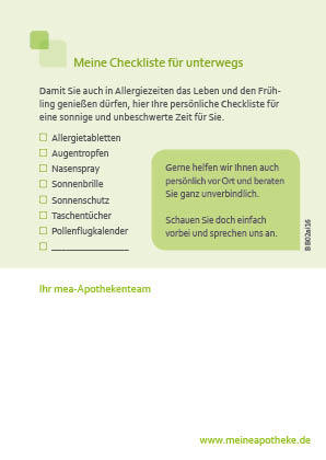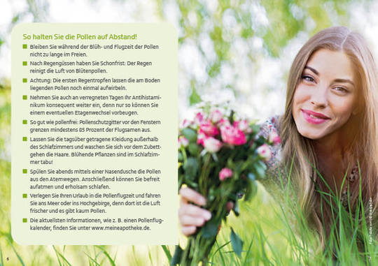 Während dieser ganzen Zeit ist es für Allergiker wichtig, auf Pollenflug-Vorhersagen zu achten und bei starkem Pollenflug das Freie zu meiden. Aktuelle Daten sind unverzichtbar, weil je nach Witterung der Blühbeginn der Pflanzen variiert. |